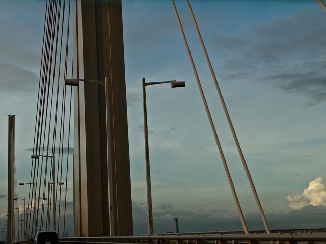 多摩川に架かる橋のひとつ。 横浜へ行く用事があり、往路復路で朝夕に渡った。