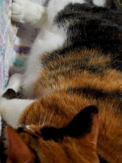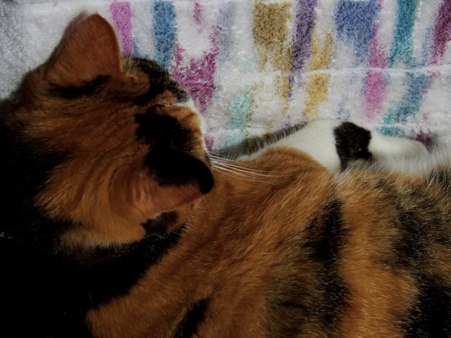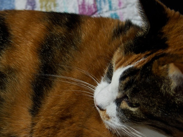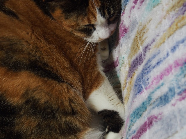 インドの平織りコットンをキャリコとかキャラコと呼ぶ。その名は、インドで産してカリカット(カルカッタ)港からイギリスへ輸出したから。港の名が変形したものだけれど、このような名称の確立は例が多い。同じインドなら、マドラス・チェックなども。 マドラスで発祥したことに由来する綿織物。どうして、三毛猫をキャリコって呼ぶのか、それが分からない。 三色の斑模様・・・。分からないけれど、我が家の三毛猫ちゃん。