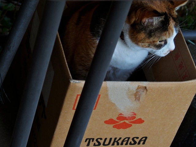 箱は、土佐の銘酒「司牡丹」である。箱があれば、猫が入る。 いちおう、これも猫の検査なのだ。人に見られると、「興味無いもんねぇ~」と出てゆくのだった。
