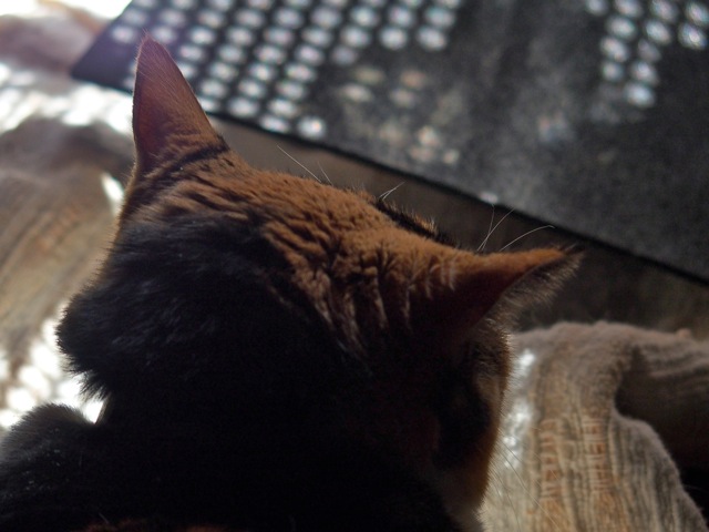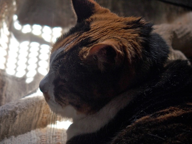 アミが寝ている所にも、モカ・トロリーの光のドットが降り注ぐ。やはり、太陽が高くなって、光の入って来るところは日々少なくなってきた。冬は身体いっぱいに水玉模様じゃなくって、光玉模様だったのにね。