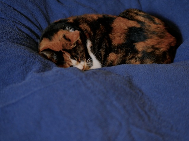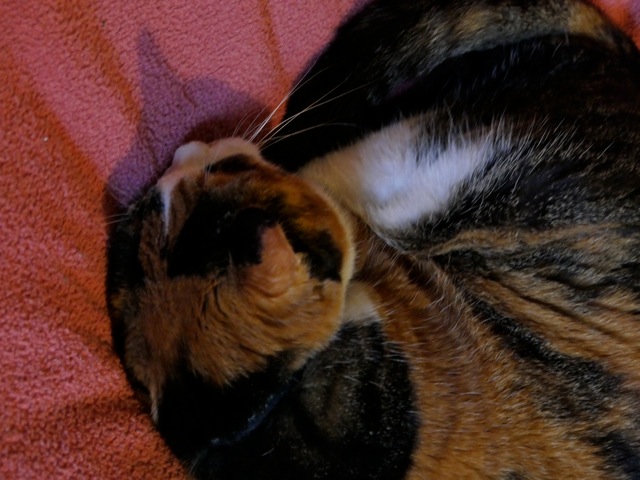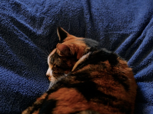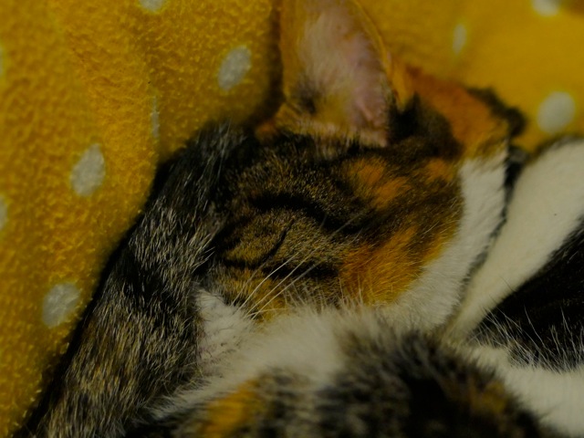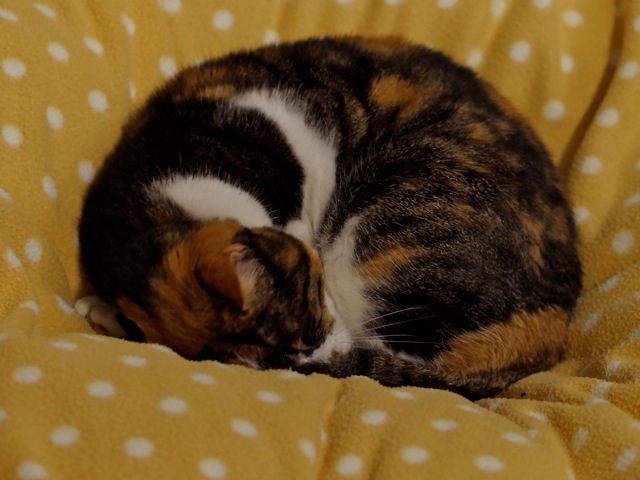ミンニャン、寝んねんの図。14歳と半年、相当な高齢となる。人のベッドで、自分が独り占めして寝ている。