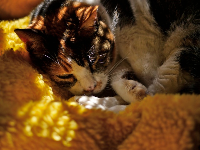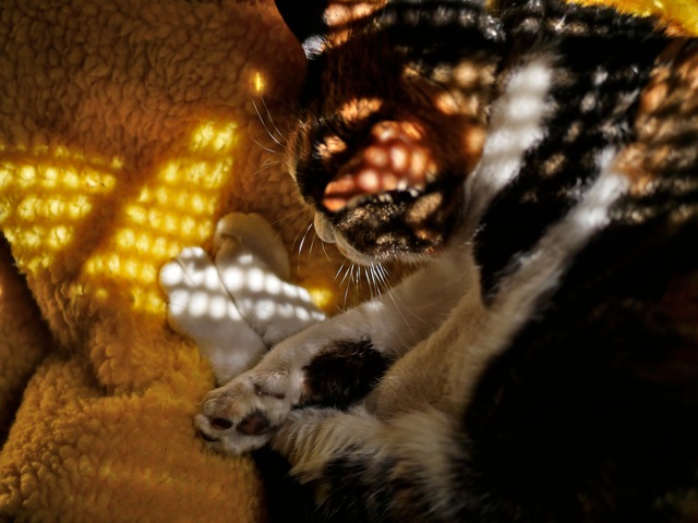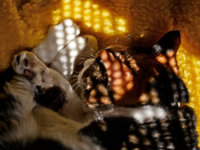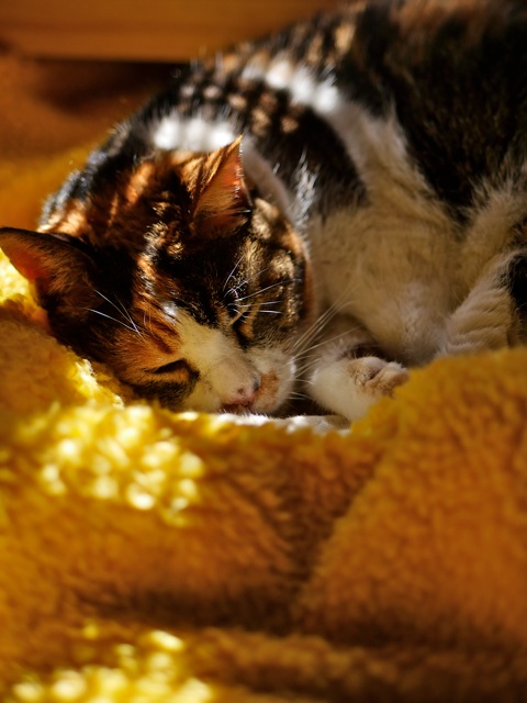 アミの敷物は、廃棄処分となるママの星見コート。前世紀のもので、防寒性能は今より遥かに劣るだろう。引っ越しを機会に捨てることになった。 最後の奉公としてアミの敷物。日だまりのアミちゃん、きょうもお昼寝。 水玉模様みたいだけれど、「光玉」?