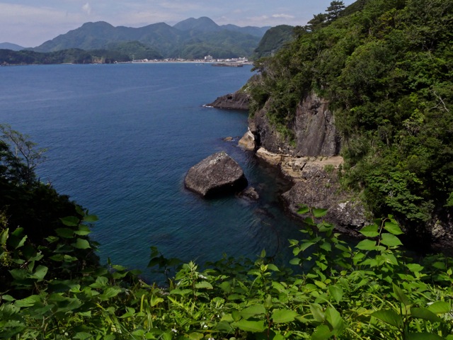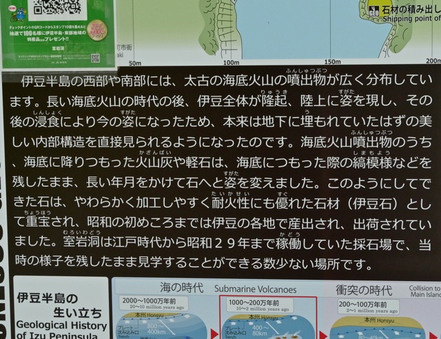かつて伊豆石を切り出していた場所という。船で運んだのだろう、すぐ近くに港も作られていた。中は暗くて湿度は高く、往来の山道も危険なところだった(笑)向こうに見えるのが松崎の街。