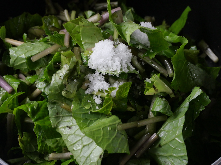 しんなりしたら熱湯をかけます、その後、好みの醤油に漬けて出来上がり。